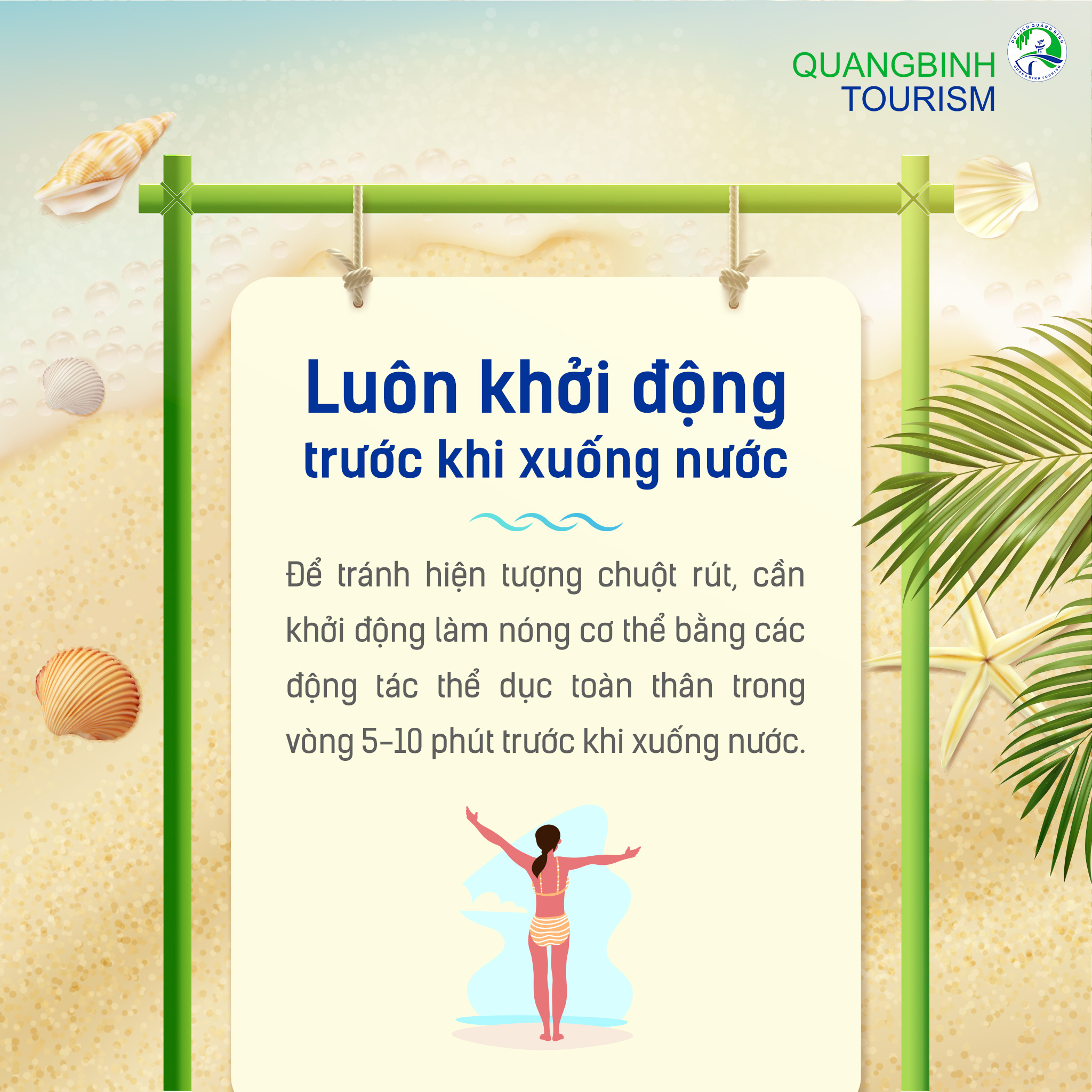 Luôn khởi động trước khi xuống nước: Để tránh hiện tượng chuột rút, cần khởi động làm nóng cơ thể bằng các động tác thể dục toàn thân trong vòng 5-10 phút trước khi xuống nước.