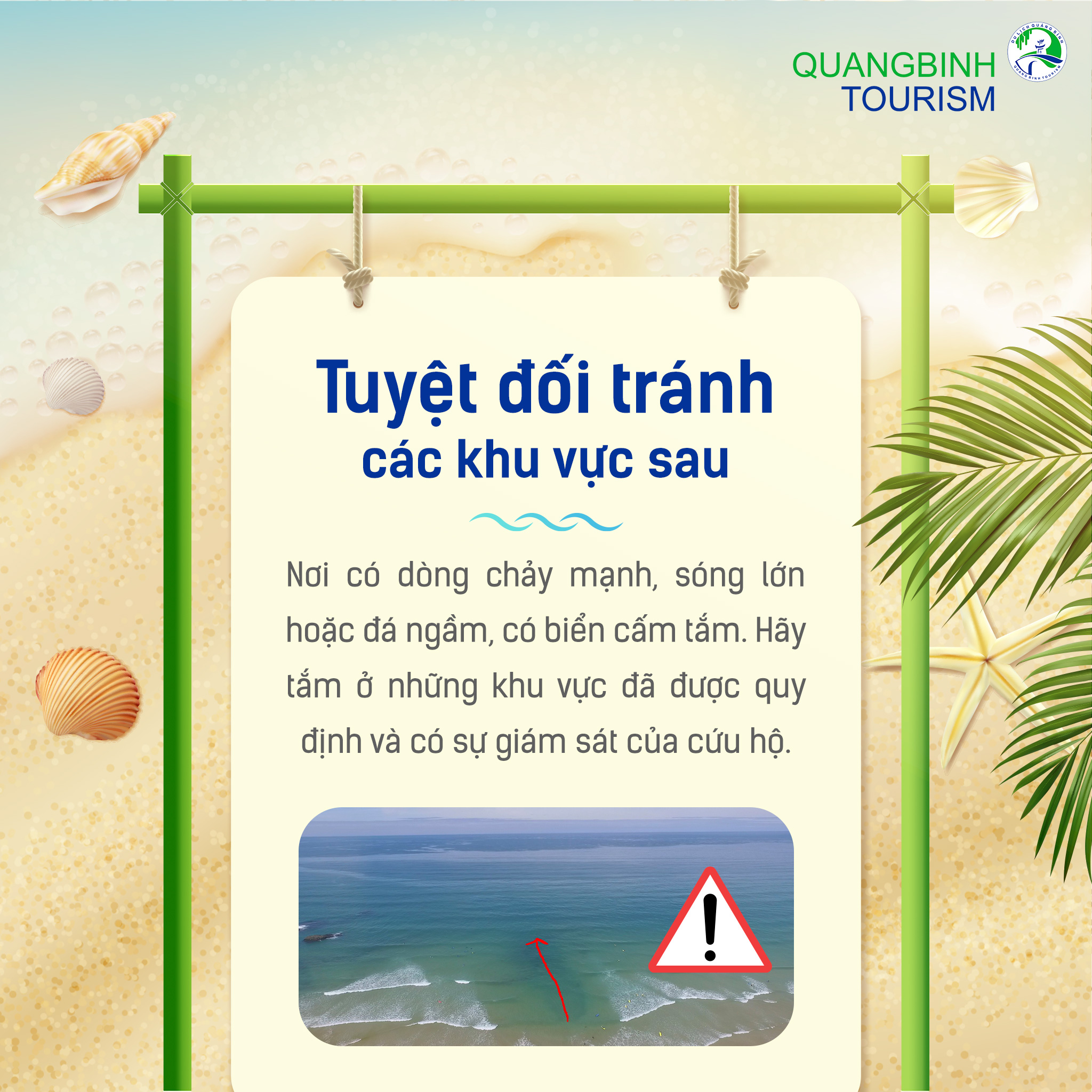 Tuyệt đối không tắm ở những khu vực có dòng chảy mạnh, sóng lớn hoặc đá ngầm. Hãy tắm ở những khu vực đã được quy định và có sự giám sát của cứu hộ.