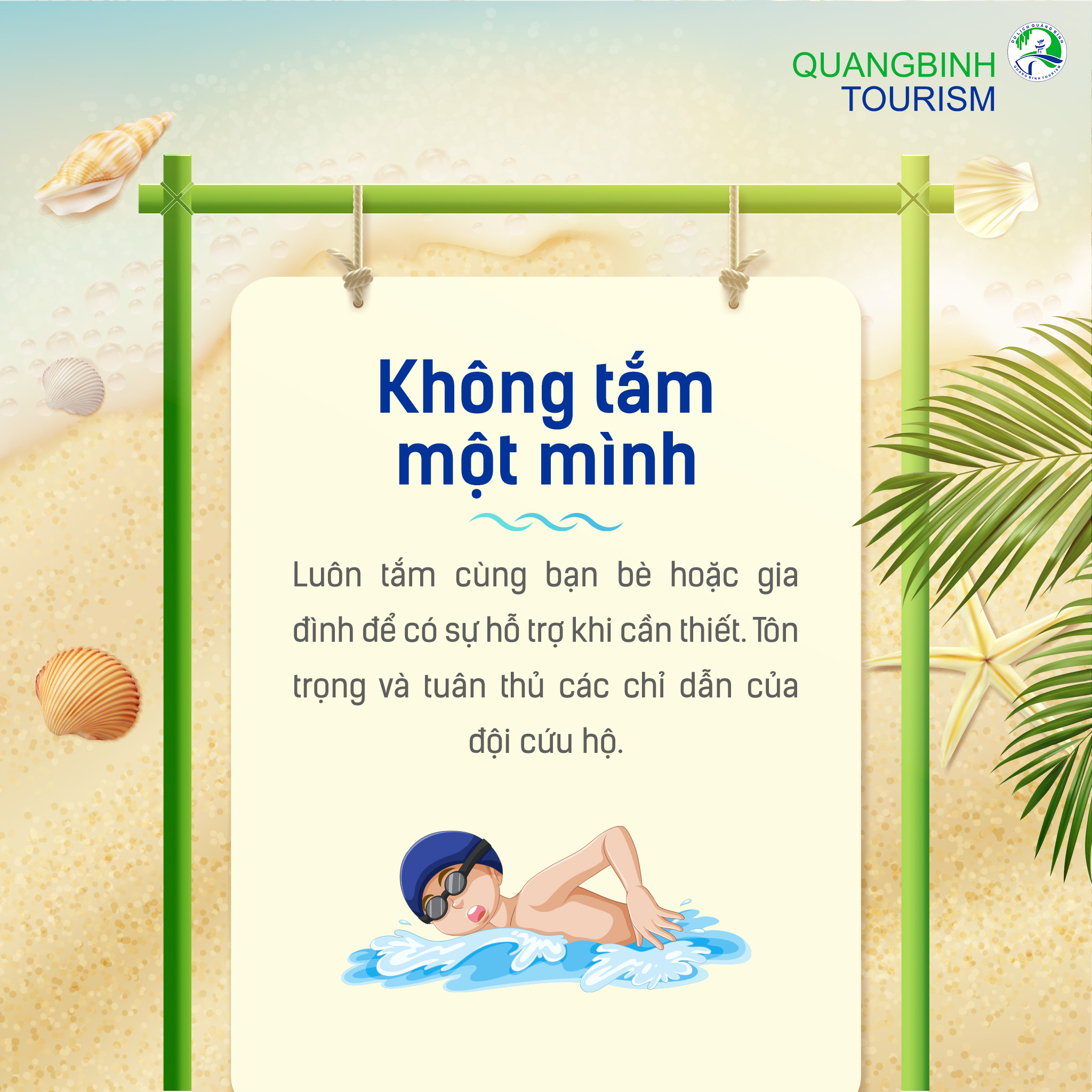 Luôn tắm cùng bạn bè hoặc gia đình để có sự hỗ trợ khi cần thiết. Tôn trọng và tuân thủ các chỉ dẫn của đội cứu hộ.