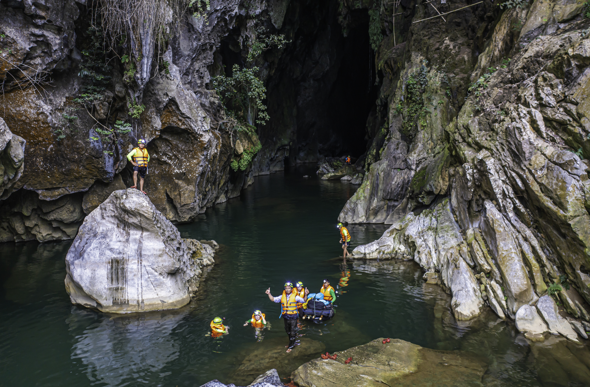 - 13:00 chiều. Khám phá bốn cấp độ hang động khác nhau rõ rệt và sau đó đi xuống một bậc thang 80m, nơi bạn có tùy chọn nhảy 5m xuống dòng sông bên dưới. Sau khi khám phá các khu vực khác nhau. Bạn sẽ ra khỏi hang bằng cách bơi hoặc thả nổi 1km trong nước ngầm trong núi. Quay trở lại lối vào, chúng ta lau khô người và uống một ít đồ uống và đồ ăn nhẹ trước khi trở về làng. Khởi hành trở lại Phong Nha sẽ vào khoảng 5:30 chiều – 6:30 chiều.